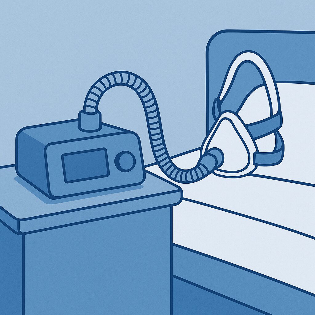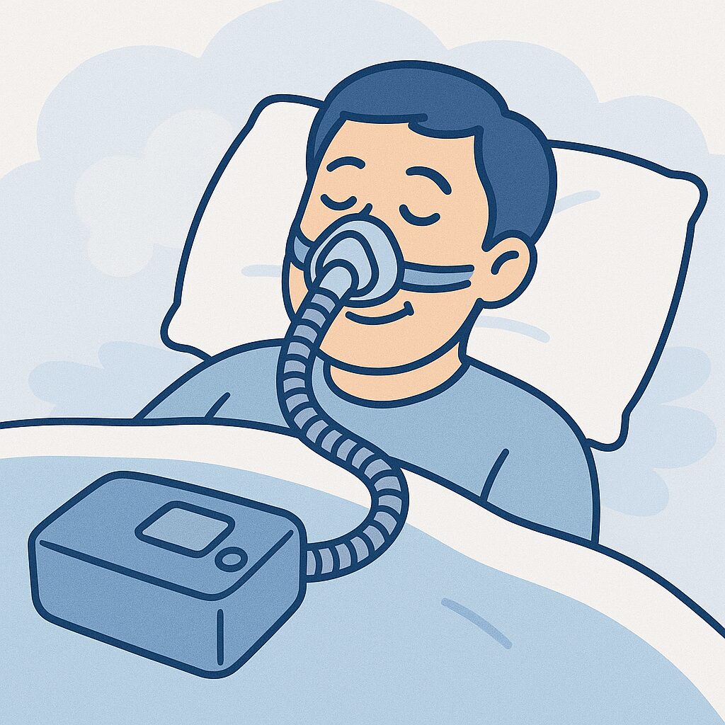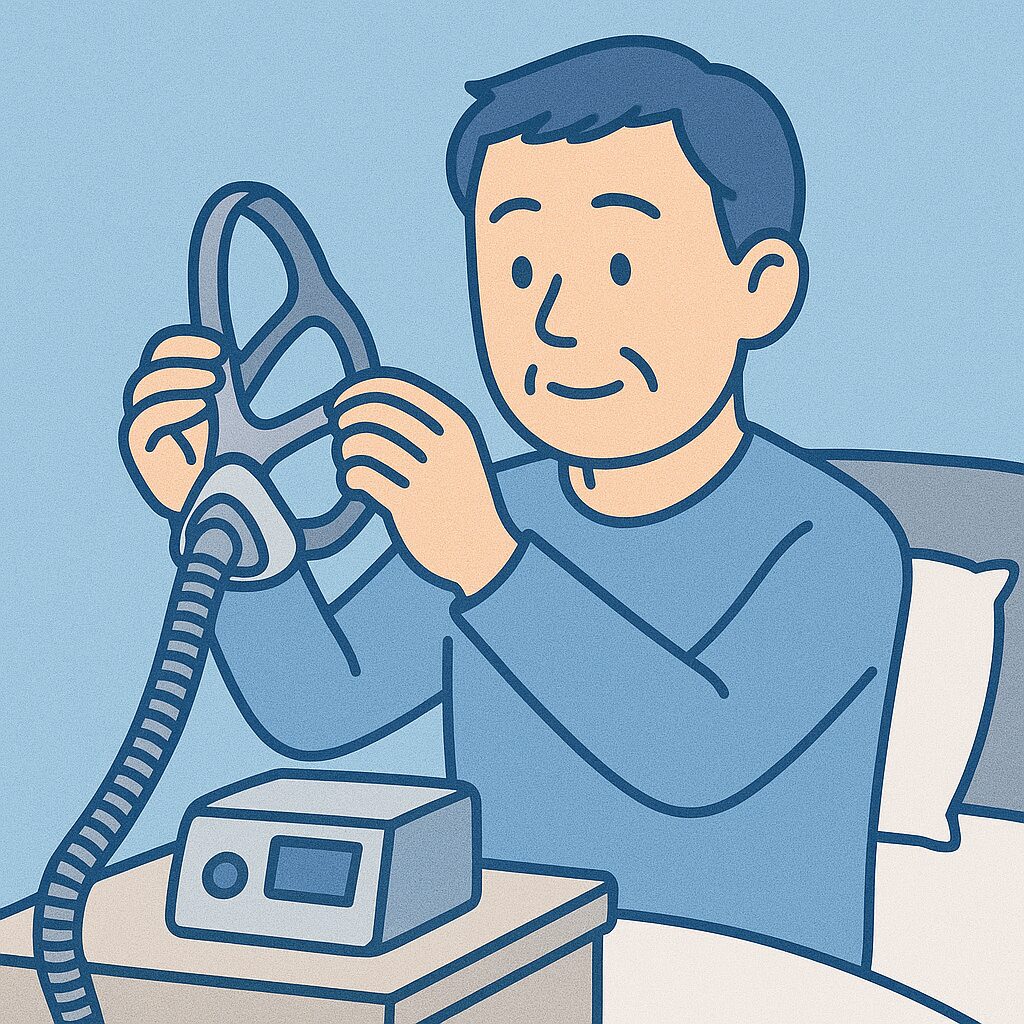 CPAPは、鼻や口に装着したマスクから一定の圧力で空気を送り、睡眠中に狭くなりがちな上気道を物理的に開き続ける在宅治療です。いびきや無呼吸・低呼吸の発生を抑え、睡眠の分断を減らして睡眠の質(深睡眠・連続性)を改善することが主な目的です。